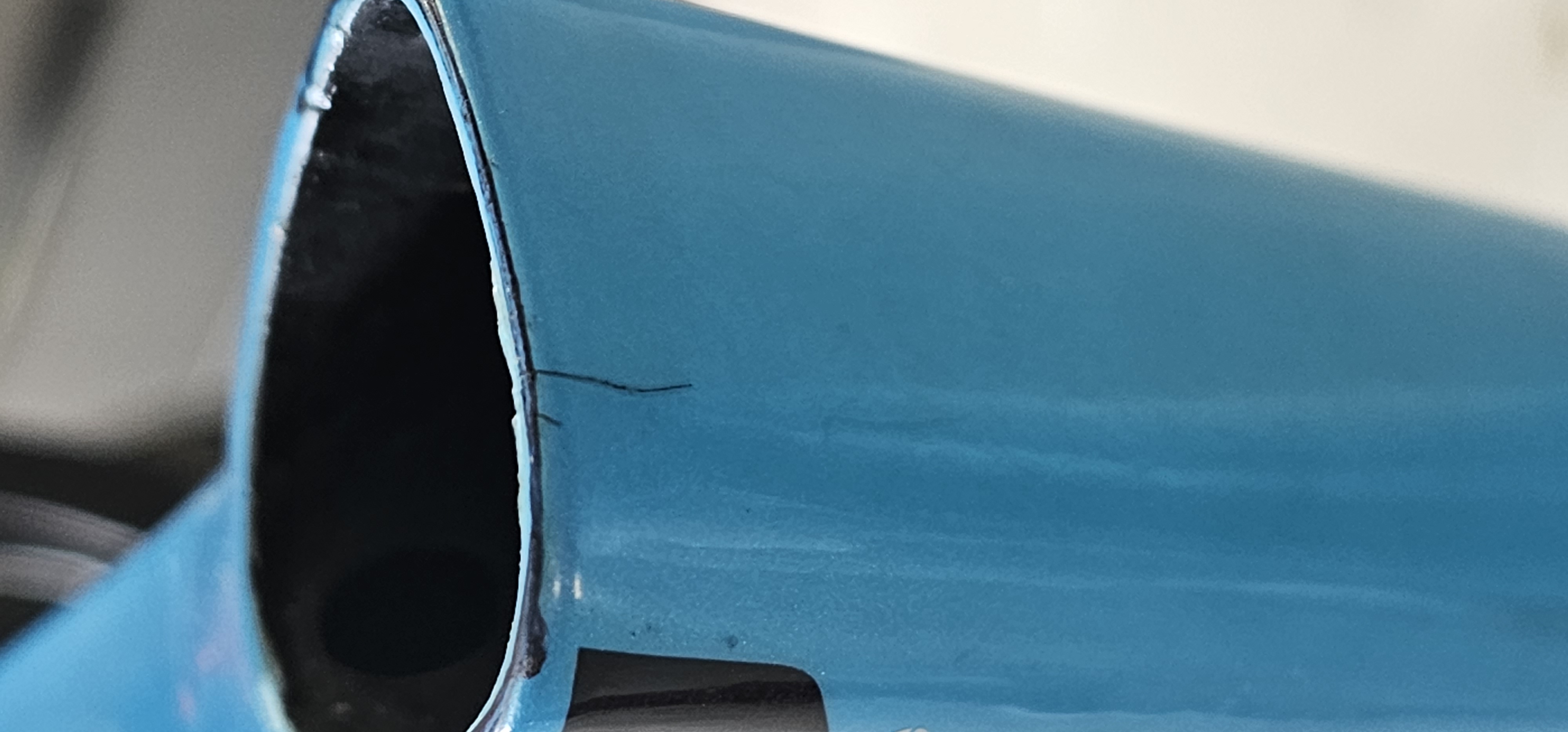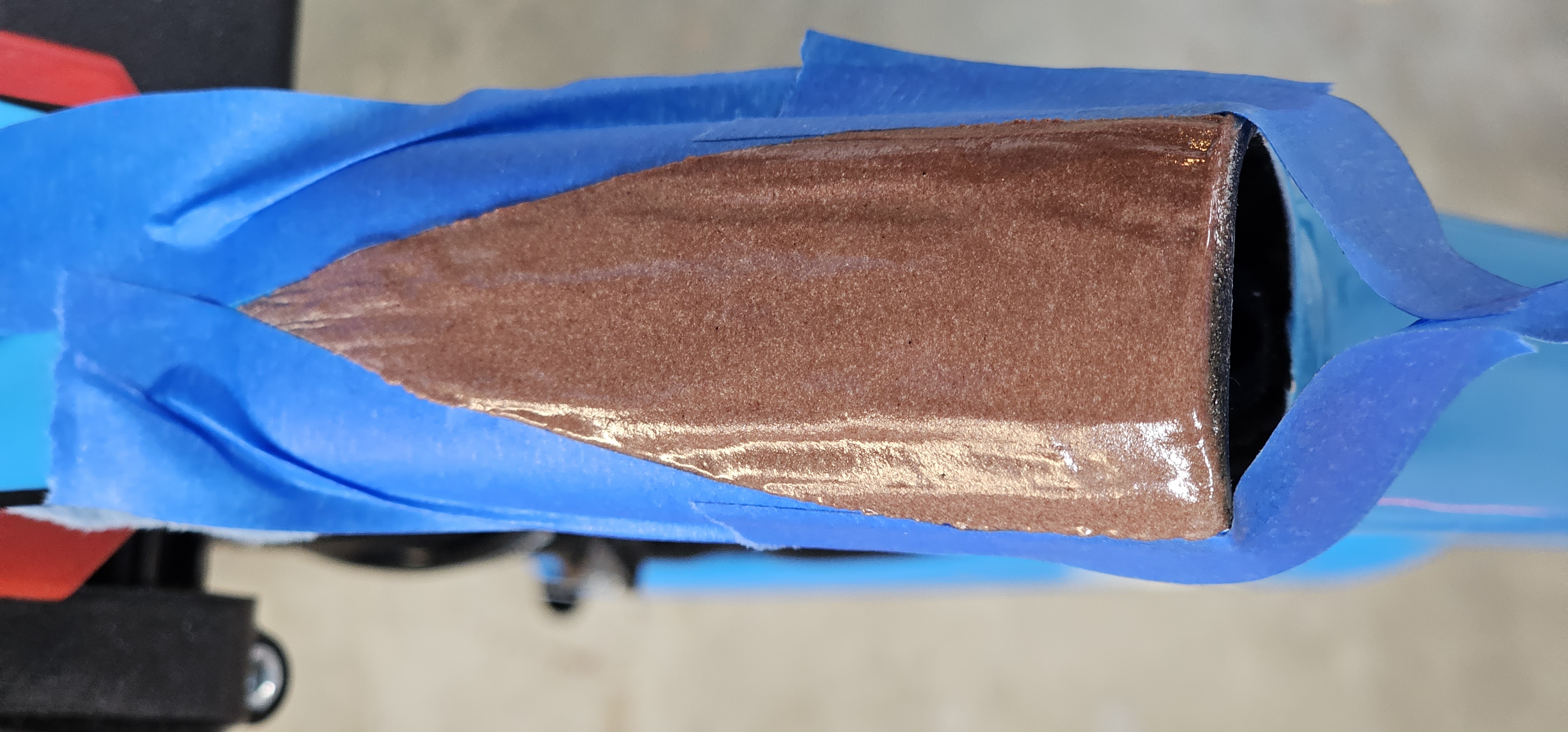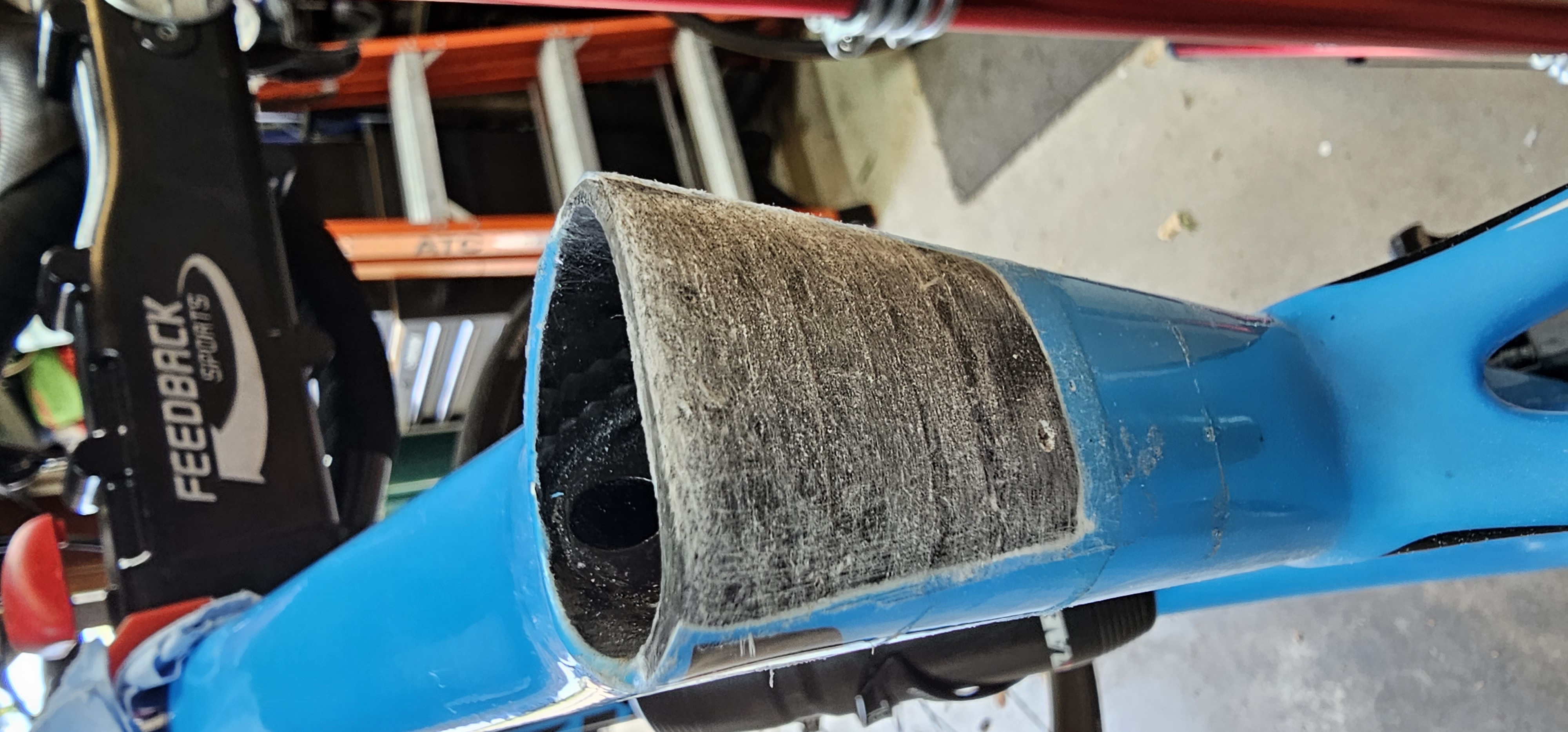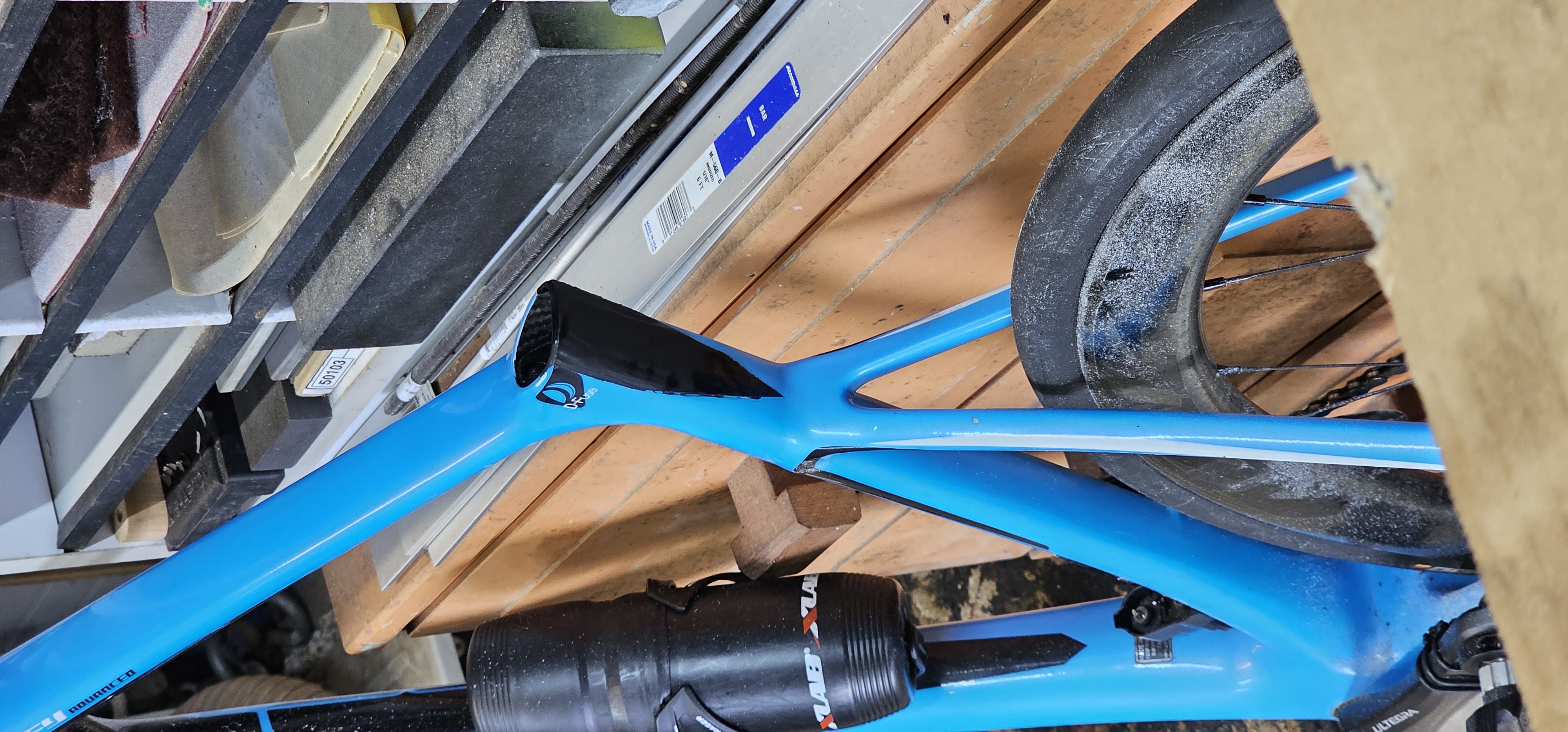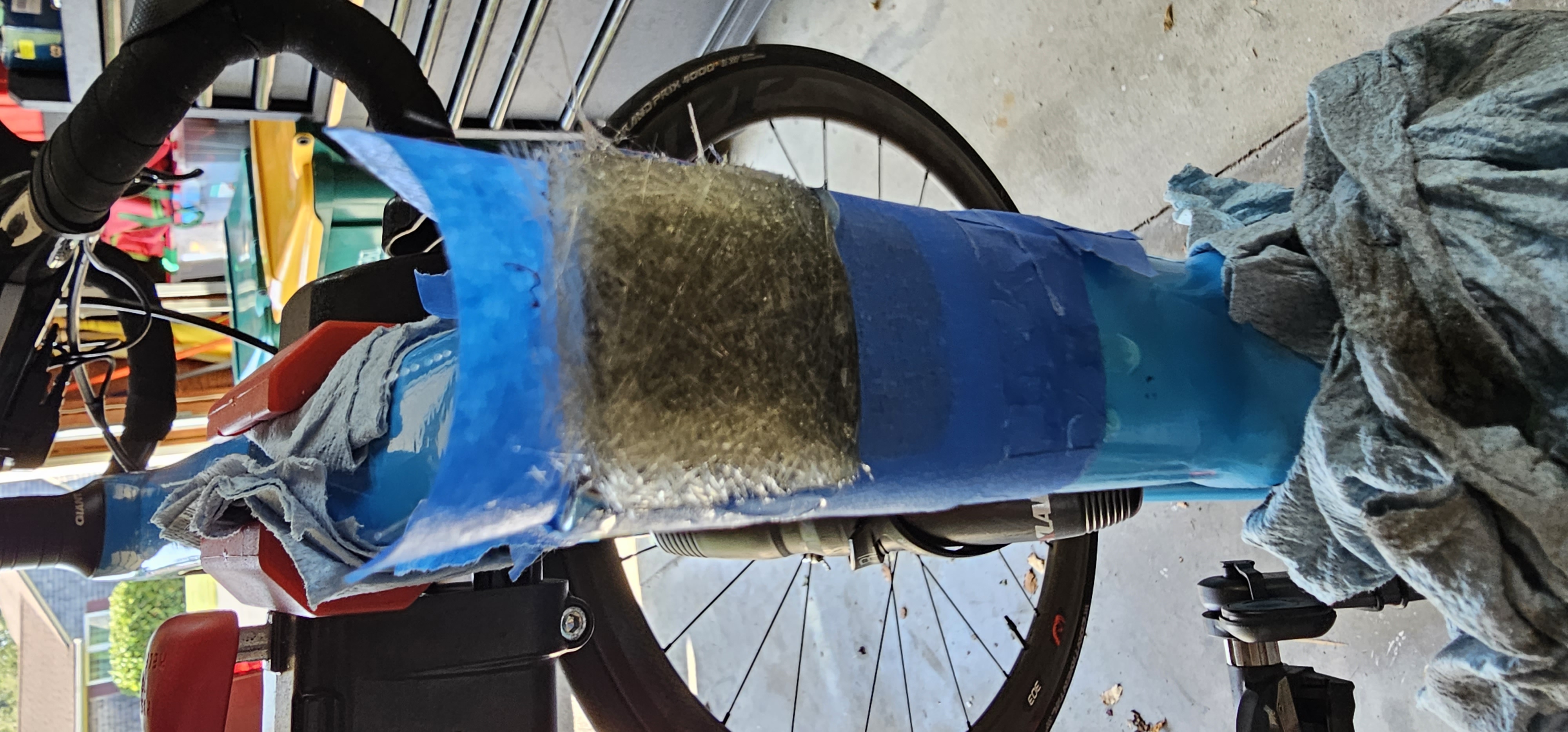 A fine crack had appeared in the top of the seat tube on my 10 year old Giant Defy Advanced road bike. A highly stressed area and a real problem if it fails while riding. The repair consisted of grinding the paint and filler back, inspecting the outside of the tube - nothing obvious - perhaps a hair of resin starvation in the original carbon tube. Inspecting the inside of the tube - nothing. Then I applied multiple layers of epoxy compatible glass fibers "clamped" in place with tape. After curing and filing smooth - the area was masked into a "pointed" shape. Then a layer of thickened epoxy applied, dressed smooth and then painted black to match the bike trim. No attempt was made to blend the repair down to original thickness. It was left proud with extra reinforcing material to be sure the area was stronger. The blending away in a pointed shape to distribute stress. The black paint masks the repair by making it visually obvious!
