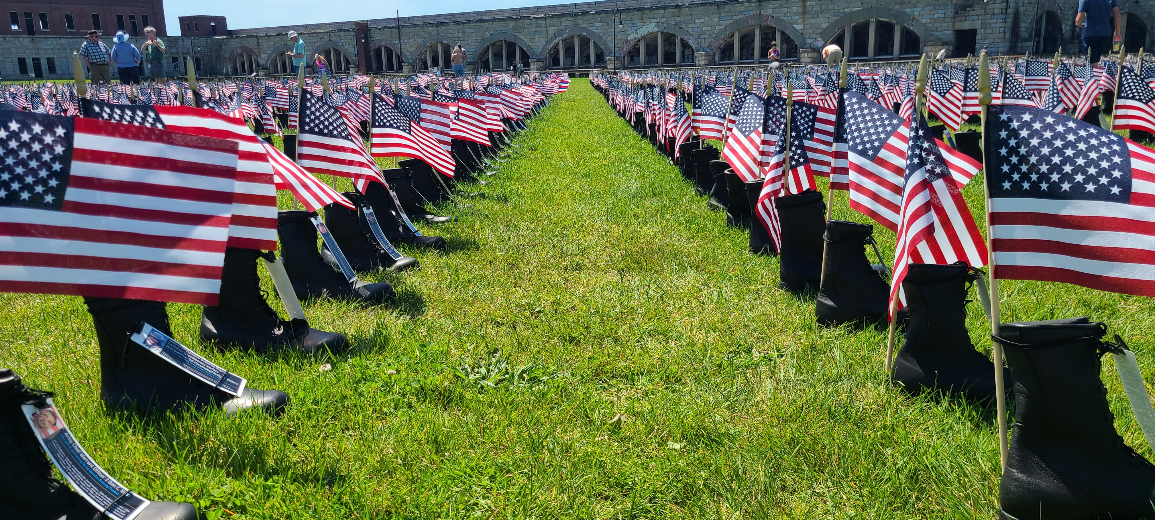 A boot for every US service person KIA in the War on Terror since 9/11.  Arranged by State alphabetical order.  Then each boot is tagged with the name of the service man or woman and the circumstances of their death.