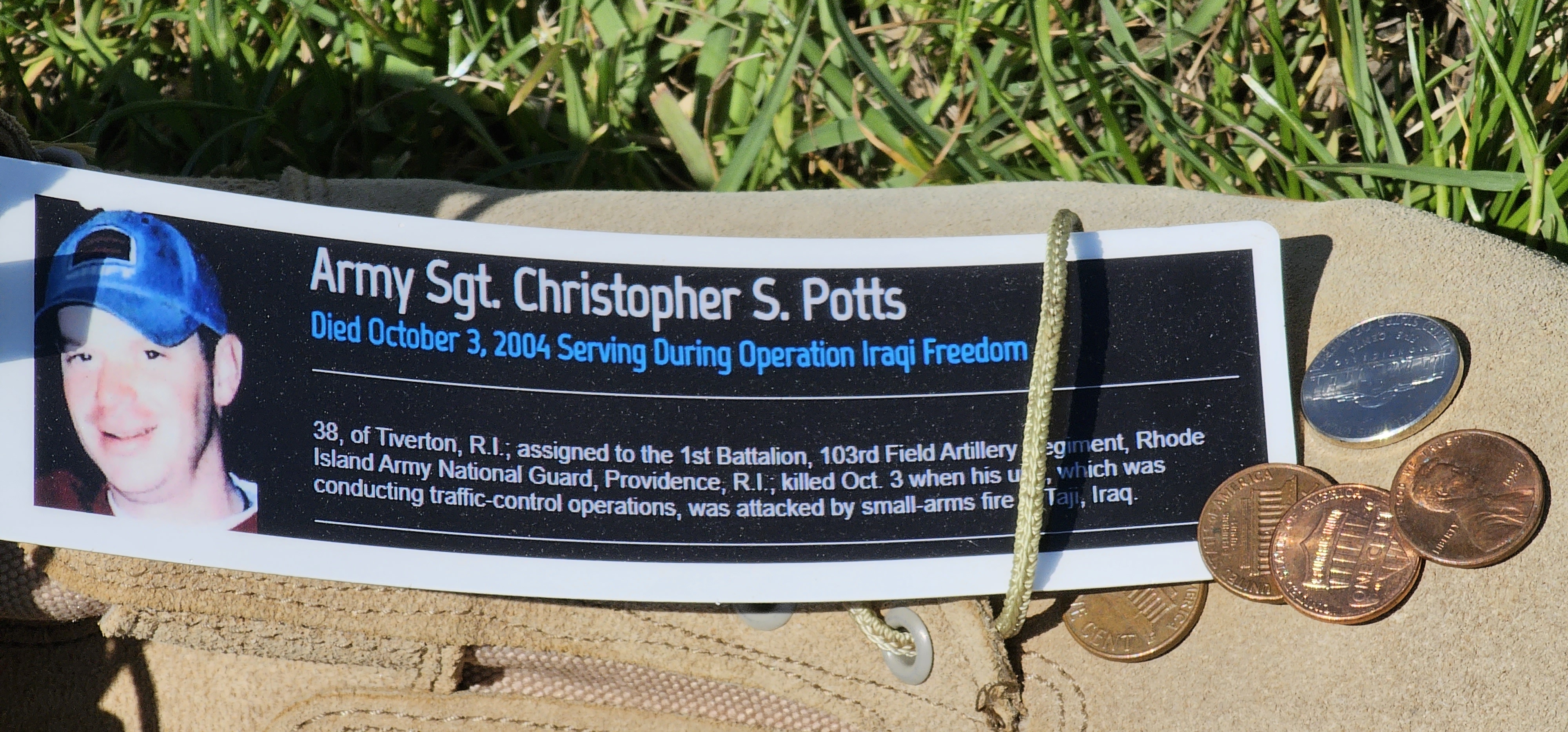 Here a late friend of Kerry's.  Christopher Potts.  Leave a - Penny – If you knew them.  Nickel – You trained together.  Dime – You served together.  Quarter – You were there when they fell.....